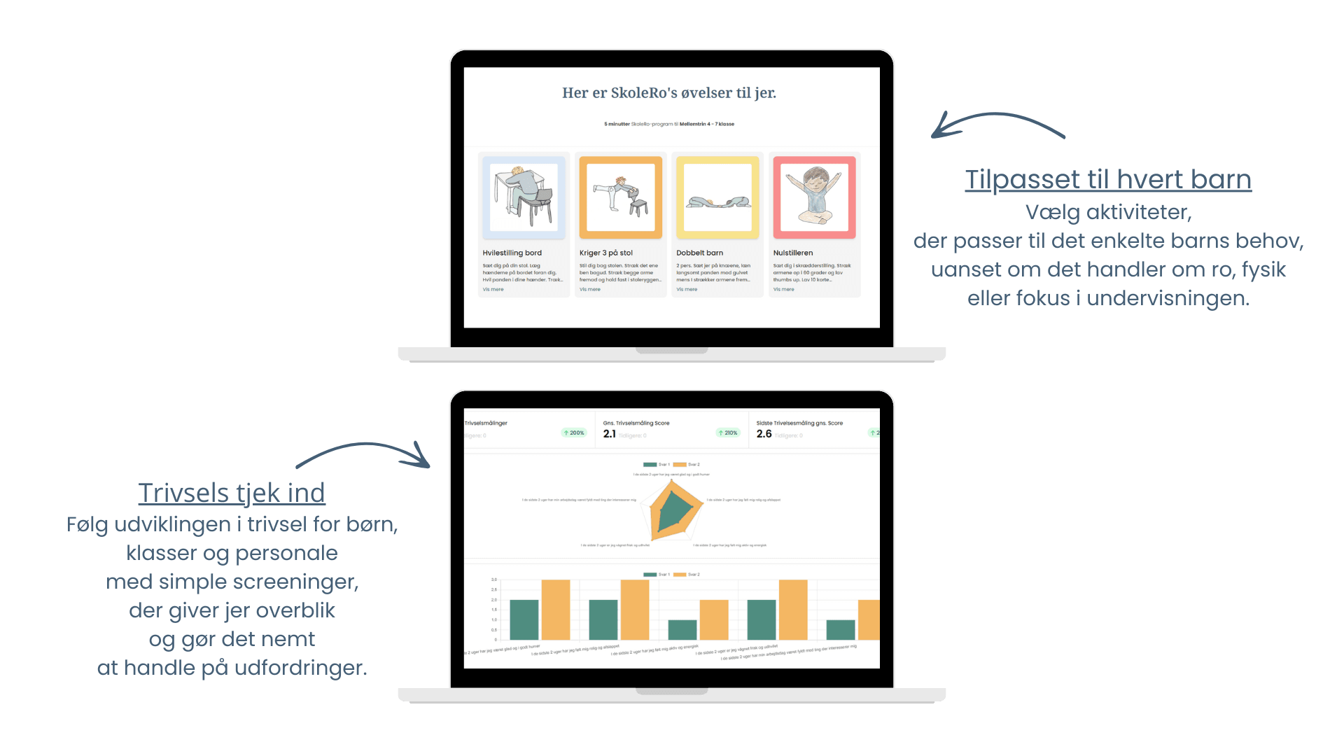 Få hele SkoleRo-systemet med øvelser, trivselstjek og forældreadgang samlet ét sted – uden dyre tilkøb eller skjulte gebyrer.